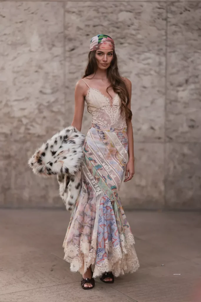 A handkerchief hem dress requires a matching handkerchief, and what better way to wear it than as a head wrap? Coordinating hues and patterns complete the design and evoke pictures of the modern-day flower child, delicate and calm. Peep-toe sandals with a little handbag make for simple and minimal accessories.