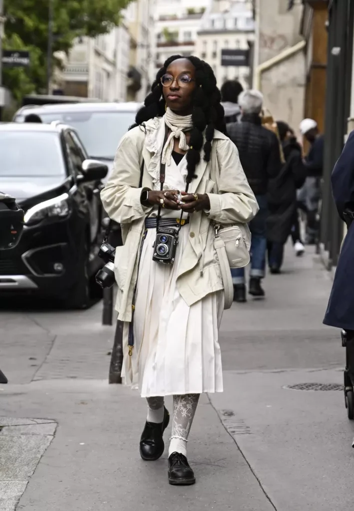 A pristine cotton dress layered underneath a matching trench coat calls for an explorer-inspired neckerchief. Wrap a thin knit or woven scarf around your neck and tie in a casual knot, and you’re ready for any city trip. Don’t forget to bring your old-school camera to capture eye-catching street fashion.