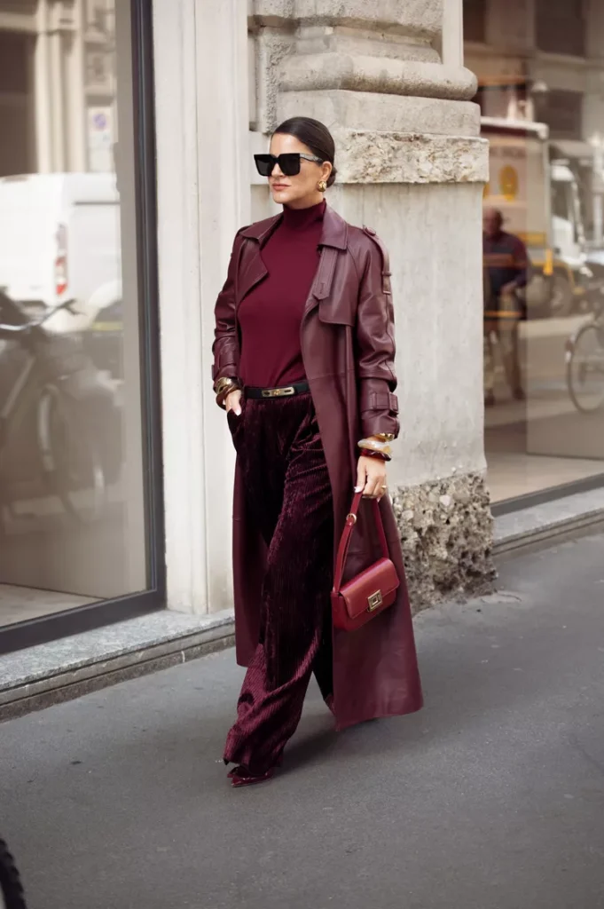 Wine red is one of the top autumn color trends, therefore it makes sense to rely significantly on this chromatic tale when wearing a leather trench coat. For an incredibly gorgeous midday look, go all monochrome with gold accents.