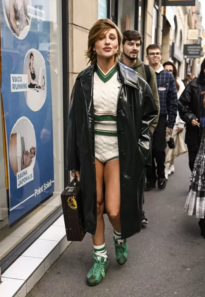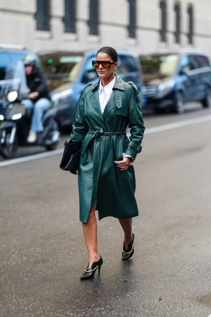 This year’s tenniscore frenzy is far from over. A leather trench coat can be used to elevate a tennis-appropriate attire off the court. Once again, contrast is crucial to make this look work, with the soft knit set standing out against the luscious green leather coat.