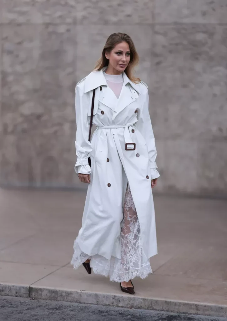 If you believe a delicate lace dress doesn’t go well with a leather trench coat, think again. This look is so appealing because it strikes the perfect mix between edge and ladylike. Still, maintaining the palette in similar colors, or even monochrome, helps to ground the contrast and create a coherent effect.