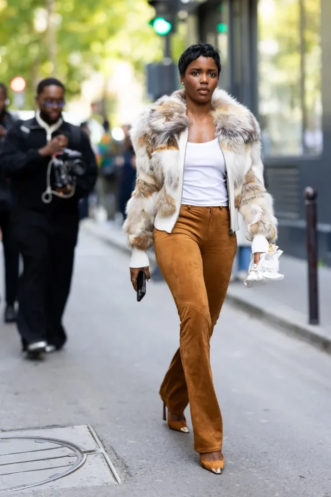 Low-rise pants are back in style, and if you want to make your brown pants more fashionable, this is a great option. (It is clearly optional to wear a contrasting underlayer, as Caroline Daur does here.) Wear long pants with pointed toes below.