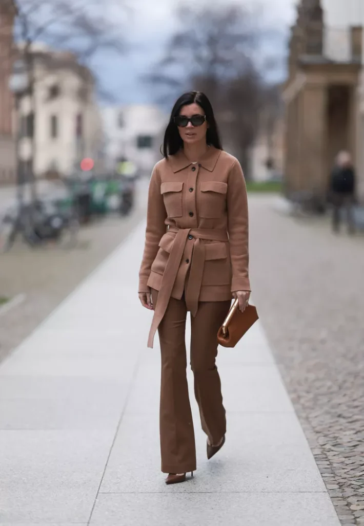 Flare or bootcut pants are an appealing style that serves as a basic trouser alternative. The jacket, shoes, sunglasses, and bag are all near-matches (meaning they’re almost the same hue but not quite), creating a tonal style that’s not dull.