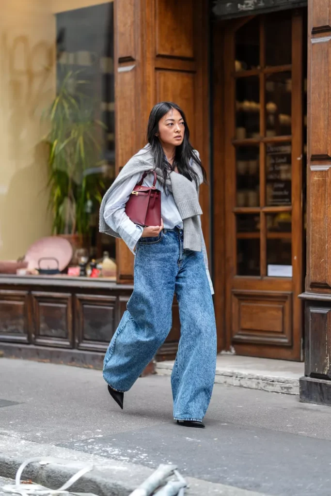 First, we have the palazzo denim. A very wide-leg jean is simple to style: just wear it like any other wide-leg pant in your closet. To balance out the volume on the bottom, pair a structured top—like this button-down—with a cropped or textured jacket or jumper that doesn’t extend past your hips.