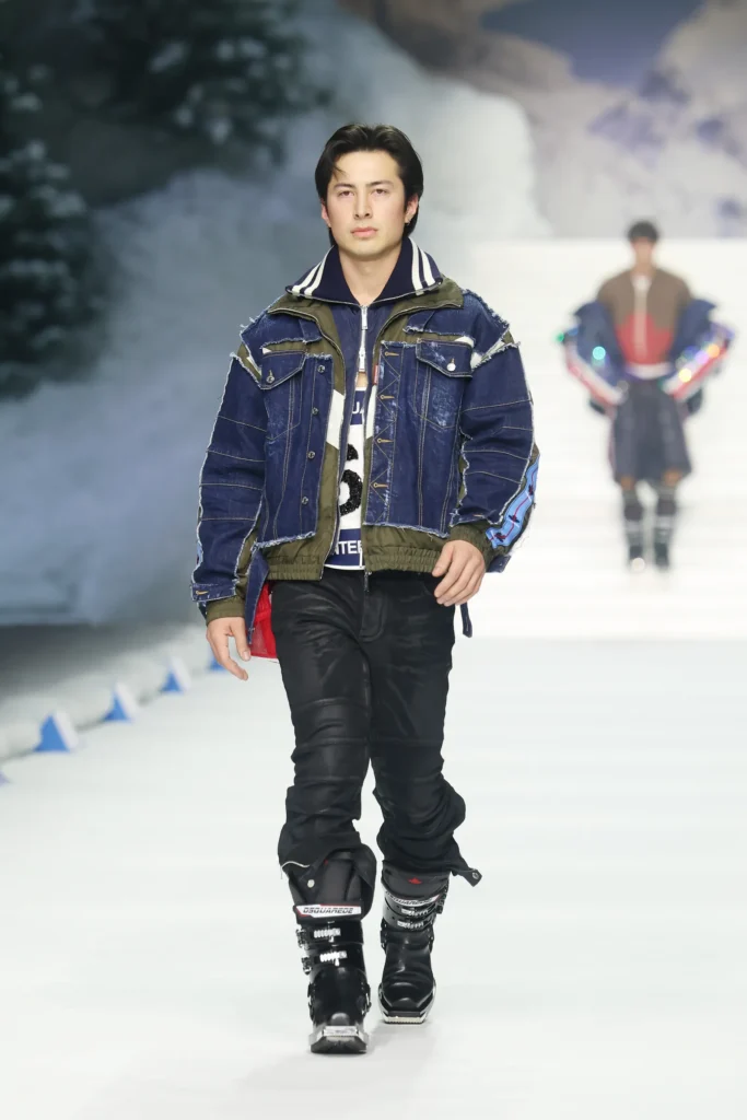 Williams unveiled the Dsquared2 runway, which was designed to resemble a white mountain top. For his big moment on the runway, he was dressed in an ultra-layered suit that included a tattered jean jacket above an army green bomber. Closer inspection reveals a row of Canadian maple leaves up and down the jacket’s arm sleeves, a tribute to the actor and creators’ common background. The striking piece was worn over a blazer with a varsity-striped collar and graphic tee underneath. He also wore black tight pants that were crushed over a pair of massive, nearly knee-high black snow boots.