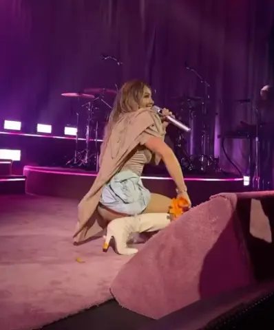 She donned an iconic nude bodysuit with the most surprising avant-garde touches, such as a gigantic folded cloak and enormous pale blue crinkled rosettes, in a video of the spectacular encore released by Live Nation. Think more futuristic runway and less Lizzie McGuire. She accessorized the ensemble with white heeled boots that reached her knees.