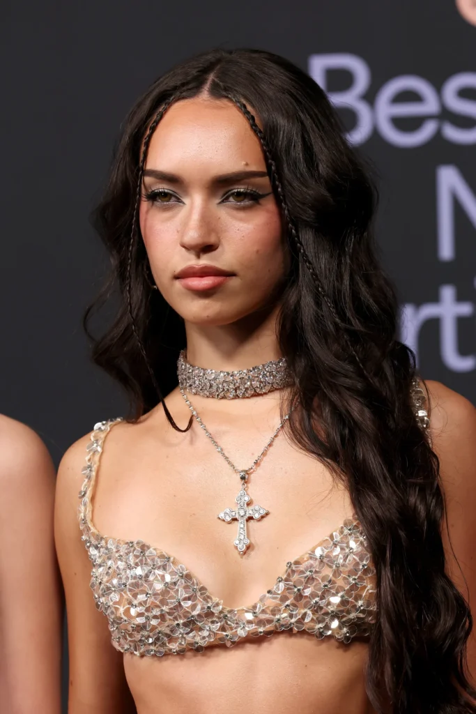 KATSEYE members turned heads with their silver, pink, and green attire. Megan donned a shell-pink short dress with tiny silver and crystal beadings on the chest and skirt, a cutaway on her lower tummy, and a soft, long train falling behind her. Daniela chose a midriff-baring two-piece consisting of a shimmering silver sheer fishnet maxi skirt with crystal flower inserts and a bra top, which she accessorized with a dangling cross necklace and a tick crystal choker.