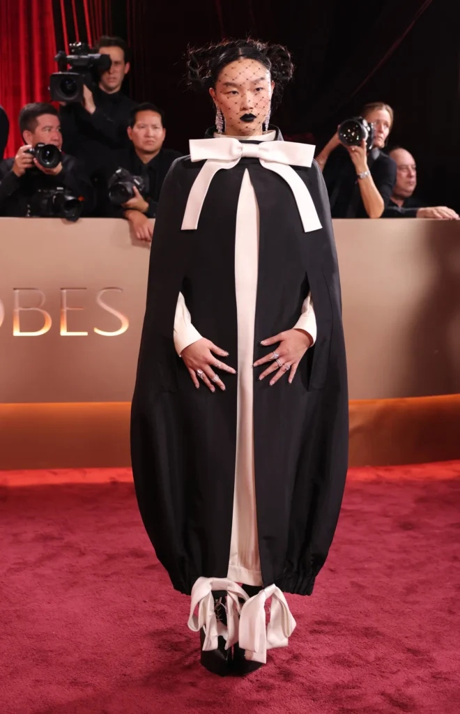 EJAE, who voices HUNTR/X’s leader and main singer Rumi, wore a strapless black gown with lace detailing and a bubble hem, accessorizing with silver jewelry and a slicked updo.