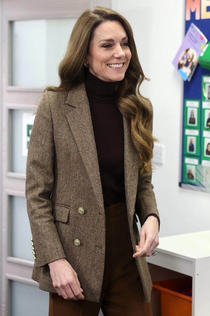 Kate looked beautiful in the morning, wearing a fitted blazer by Holland Cooper, a mocha brown rollneck pullover, and Jigsaw trousers in terracotta tones.