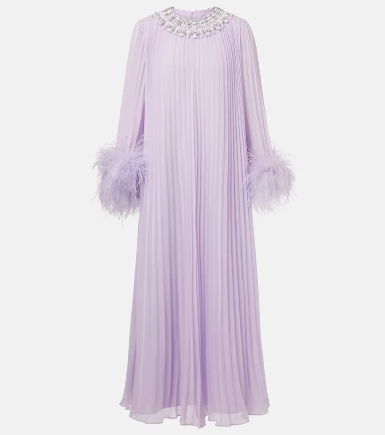 Feather-Trimmed Plissé Chiffon Maxi Dress