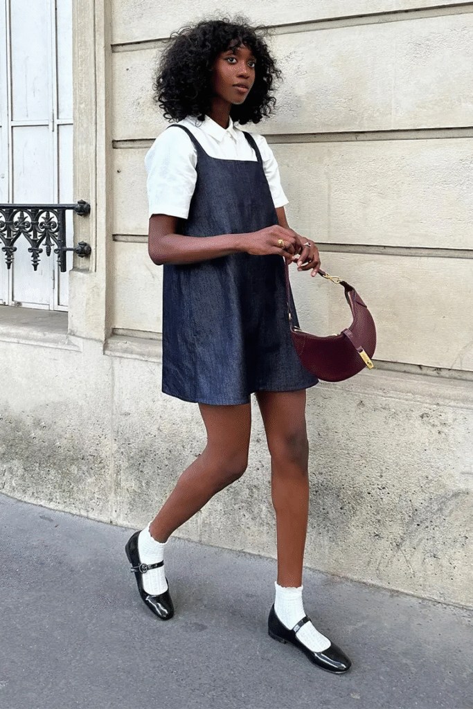 The easiest way to embrace the dress’s overall preppy vibe when dressing a navy denim dress is to wear it with black ballet flats.