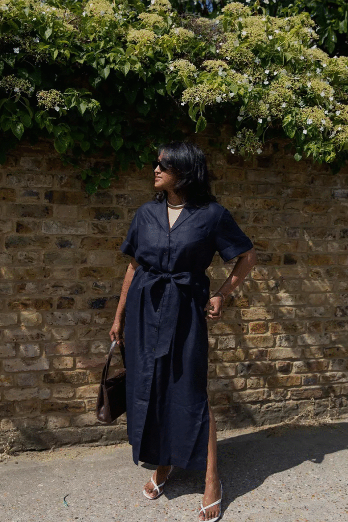 If you want to wear the trademark navy shirt dress to work, you should keep the styling simple. Since they won’t be too noticeable, you should ideally wear it with strappy white sandals in the spring and summer.