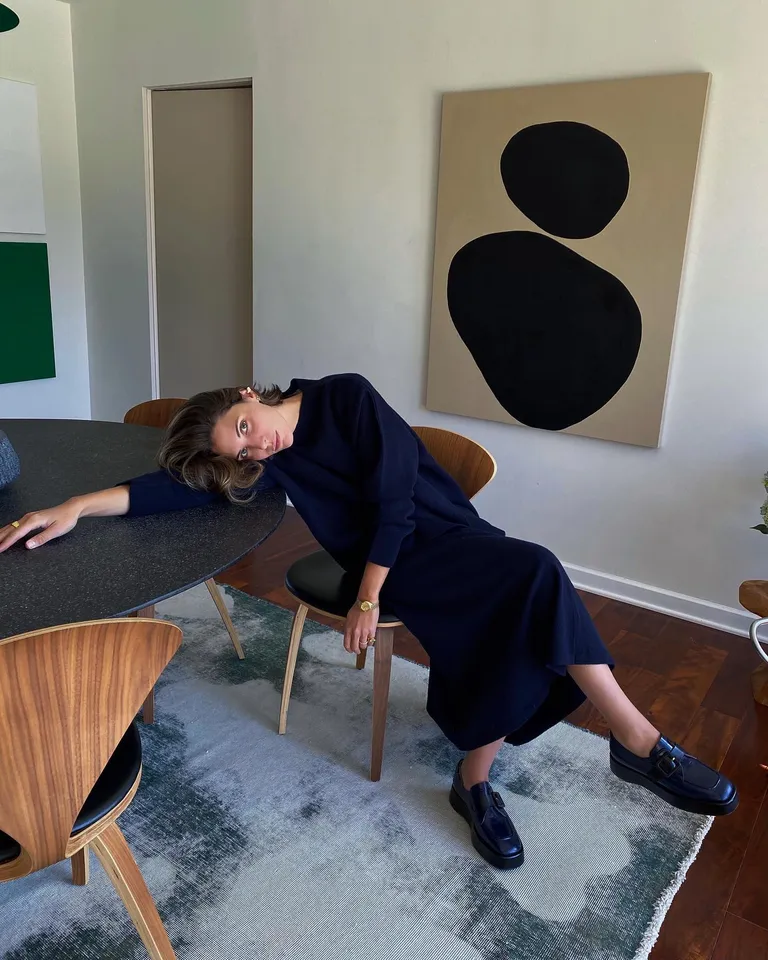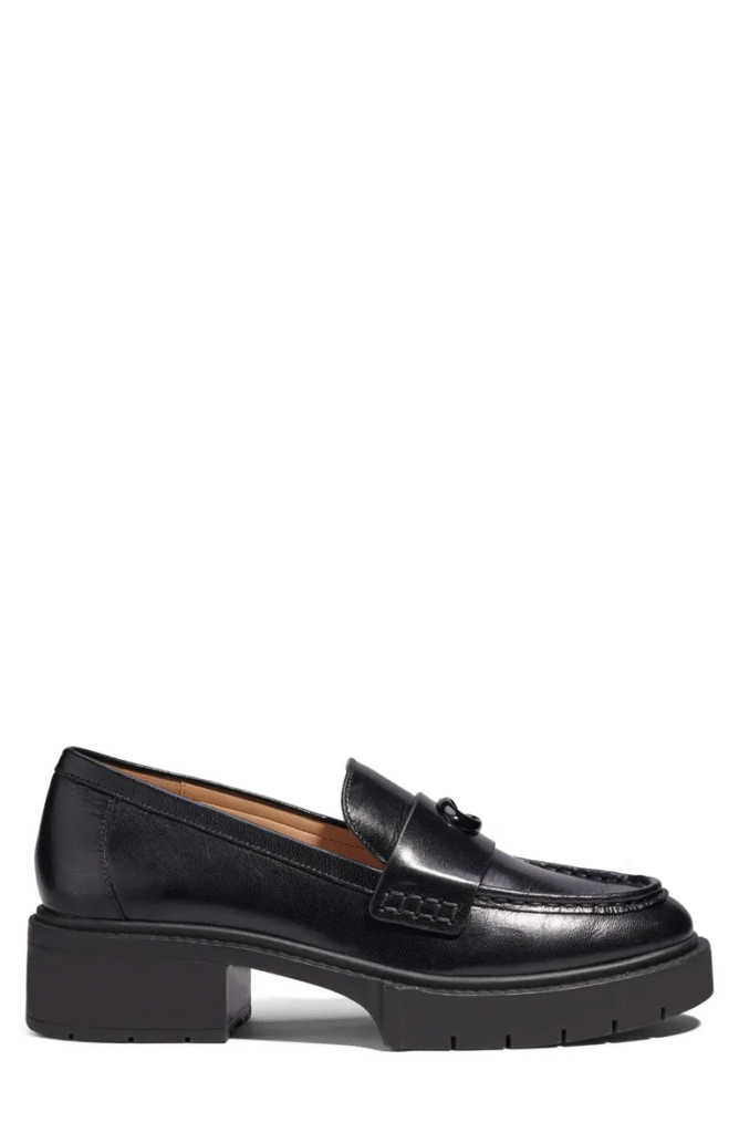 Chunky black loafers are yet another closed-toe shoe choice that always goes well with a navy outfit. Almost anything goes nicely with the timeless silhouette, such as button-downs and sweater dresses.