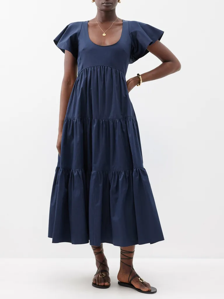 Fluted-Sleeve Tiered Midi Dress