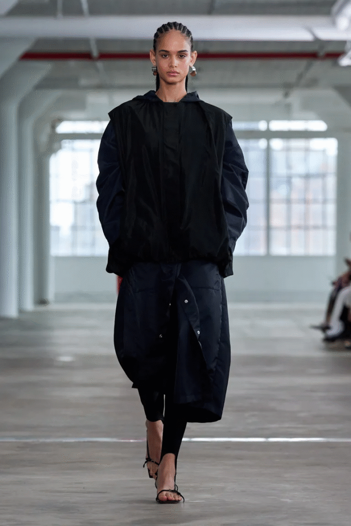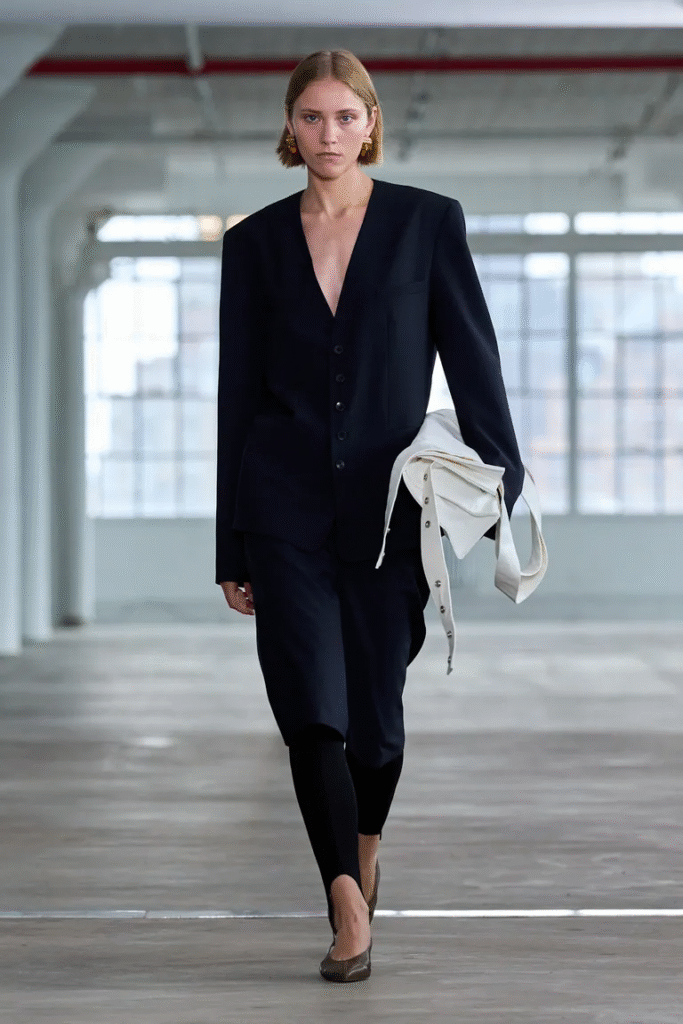 I was looking at some pictures from earlier this year’s Tibi S/S 25 presentation when it all began. I couldn’t stop thinking about two ensembles that used stirrup leggings. The models’ structured coats and strappy shoes enhanced the usually comfortable classic. The design of these leggings enabled a sliver of skin to show through in the most surprising and sexiest way possible. Sometimes, depending on the shoes you wear them with, leggings can cut awkwardly around the ankle. There was nothing casual about the leggings. Rather, they were incredibly stylish and shockingly seductive.