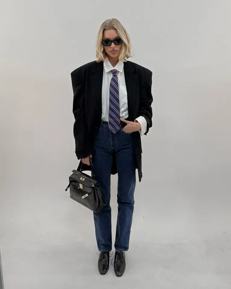 Before long, ties were all over my Instagram feed, on the grids of every well-dressed stylist, editor, and content creator. Some people, like Elsa Hosk, went for a more casual look, while others seemed to be inspired by Saint Laurent’s classic workplace style. She wore stovepipe jeans with her jacket, shirt, and tie. She did add Oxfords and a Hermès Kelly bag that looked like a briefcase, which were both excellent moves.