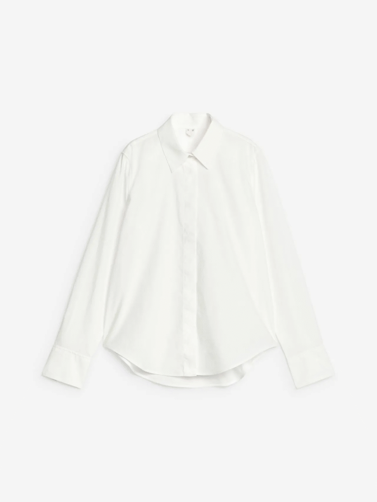 Style Notes: Button-down shirts have been popular with people like Jane Birkin, Carolyn Bessette-Kennedy, and Alexa Chung. This shirt, on the other hand, gives off an impression of high-end luxury that is typical of Sofia Richie Grainge or Rosie Huntington-Whiteley when worn with wide-leg pants. You may choose a matching set or co-ord, or a piece made of cotton poplin with wool wide-legs. Look at what they wear for ideas.