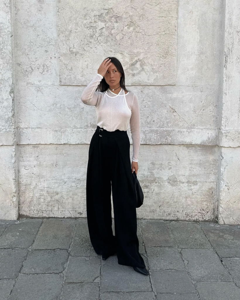 I like loose and mid-rise wide-leg pants the most, but some styles are too boxy and architectural for my taste. This makes me choose between balancing out those proportions with an equally structured top or going the other way.