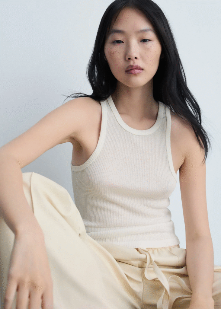 The ribbed tank top from H&M is one of the greatest. The thick material, strong straps, and price that is the same as a coffee and pastry from Gail’s make it a great buy. Go see for yourself why people love it so much.