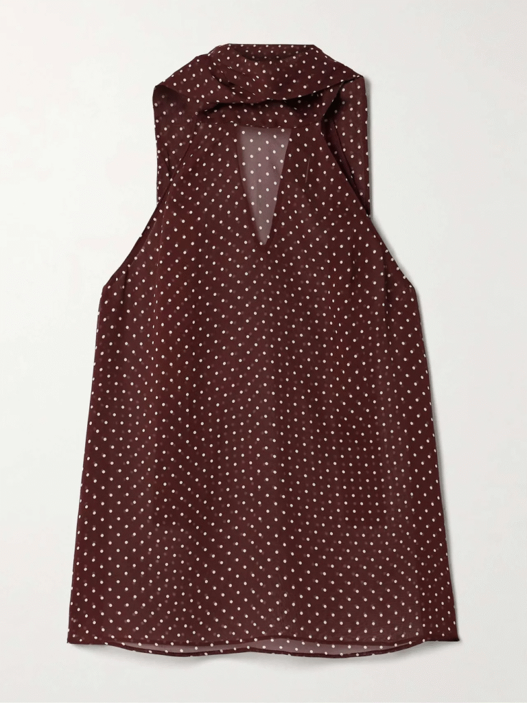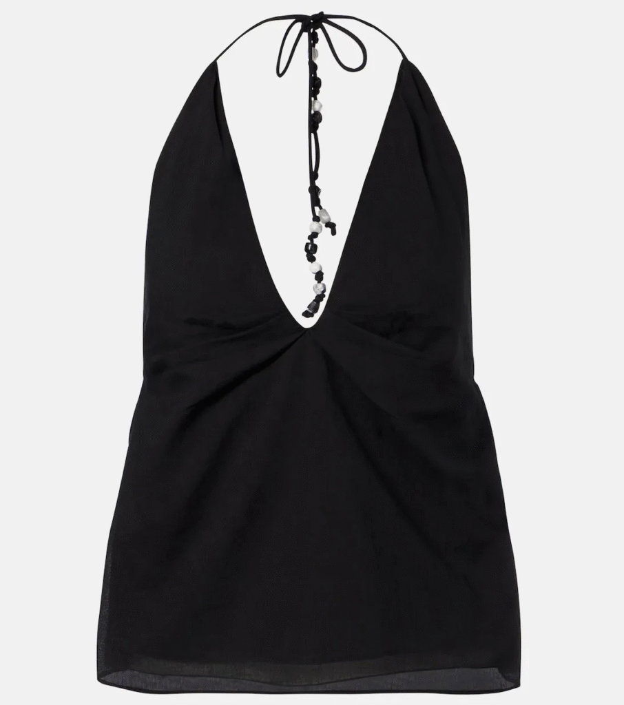 Style Notes: The 2010s have established themselves as the most prominent motif in fashion, following years in which Y2K was the most prominent motif. The return of halter necks is the most compelling indication of the dominance of this era in the fashion industry. This shape creates a gently curved silhouette that is aesthetically pleasing when paired with wide-leg trousers, which counteracts the bagginess of the hemline.