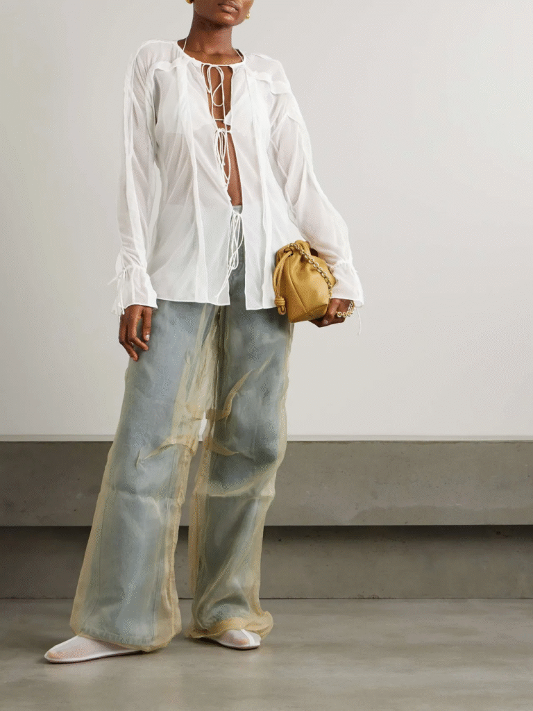 Take a look at how the see-through fabric balances out the shape of the wide-leg pants.