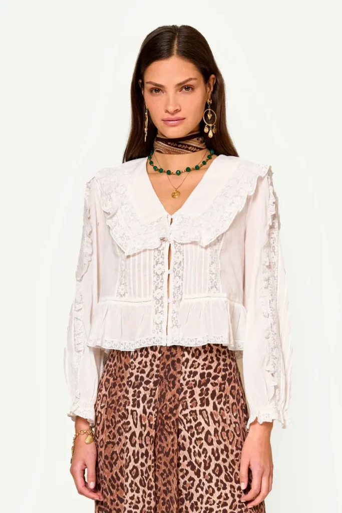 This top is a lovely choice if you’re searching for a summertime long-sleeved, lightweight solution. The collared ruffles give it a very romantic air.