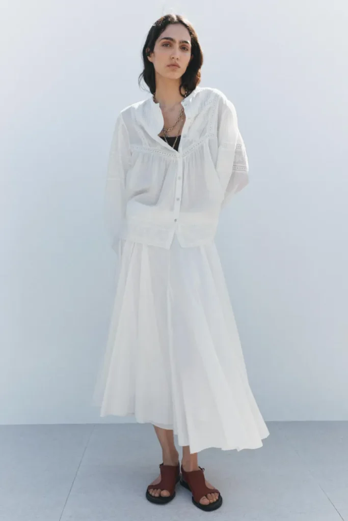 As summer gets near, I want to wear gorgeous, flowy things more and more. The bright days of the season make me want to dress in a way that reflects how light and airy they are. Soft fabrics, delicate accents, and silhouettes that are easy to look elegant in now seem more tempting than ever. When I’m in this mood, the first thing I want to wear is a white embroidered blouse. It has beautiful eyelet details, delicate flower embroidery, and is made of soft, breathable cotton. It gives me the lightness and romance I want this time of year. The openwork design not only adds charm, but it also lets in a light breeze, which is perfect for those warm spring and summer days.