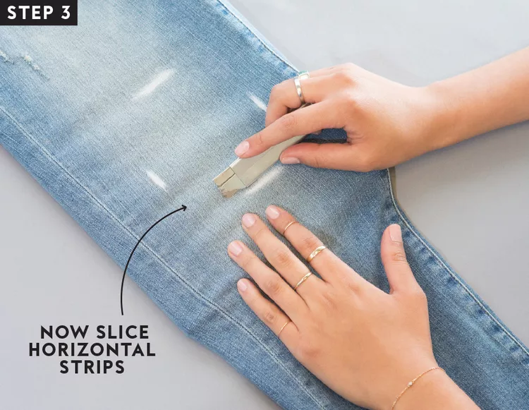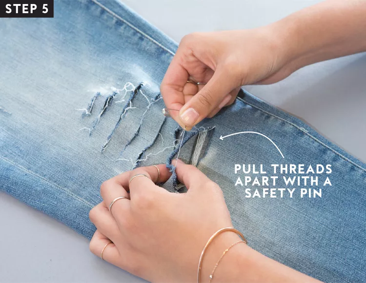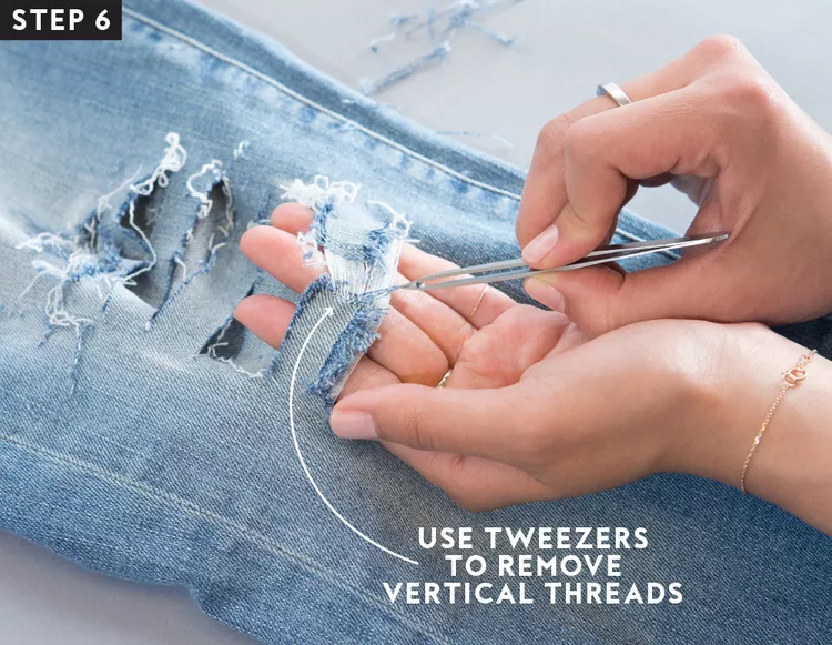 2:When you’re finished, the strip will be left with a cluster of white threads going horizontally—the beginning of your ripped hole.