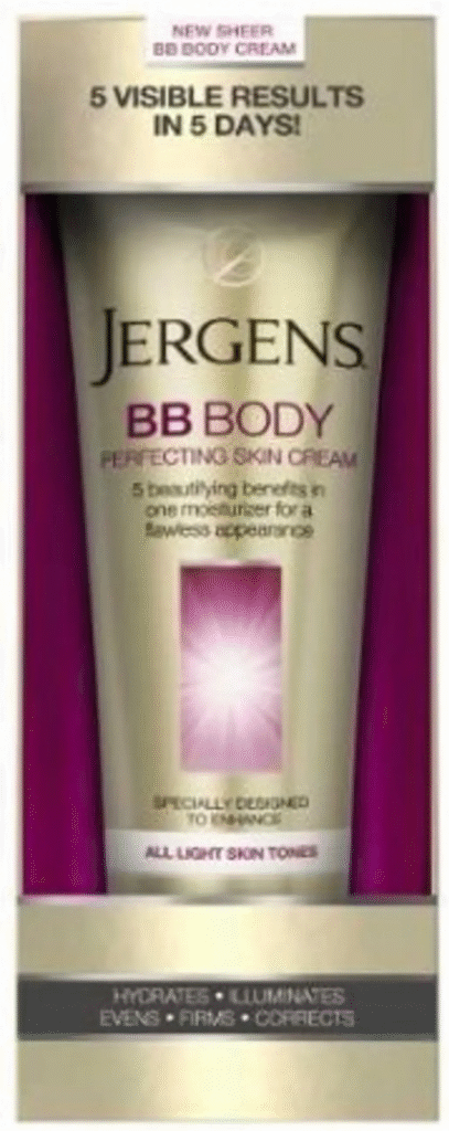 Jergens BB Body Cream is one of my favorite full-body BB creams. It comes in two colors and is great for beauty, skin, and hair coloring. It works great to cover up spider veins, light scars, and other imperfections, and the price is reasonable. I enjoy how well it mixes in and how natural it looks. It also makes faults look less noticeable over time, keeps skin moist, and helps it feel firmer. I use it a lot instead of my regular body lotion, especially on my legs.