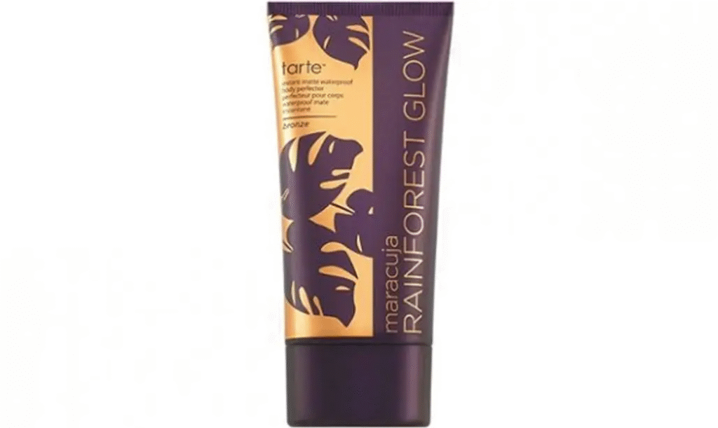 Tarte Maracuja Rainforest Glow Instant Matte Waterproof Body Perfector Tarte Maracuja Rainforest Body Perfector has the most coverage of all of the products on our list. Don’t be fooled by the darker color. It covers any flaws and gives your skin a light bronzed tint that looks great. It dries virtually right away and doesn’t leave any streaks. The mixture is full of vitamin C and maracuja oil, which makes skin look brighter and more hydrated. Even after you take it off, your skin will look great.