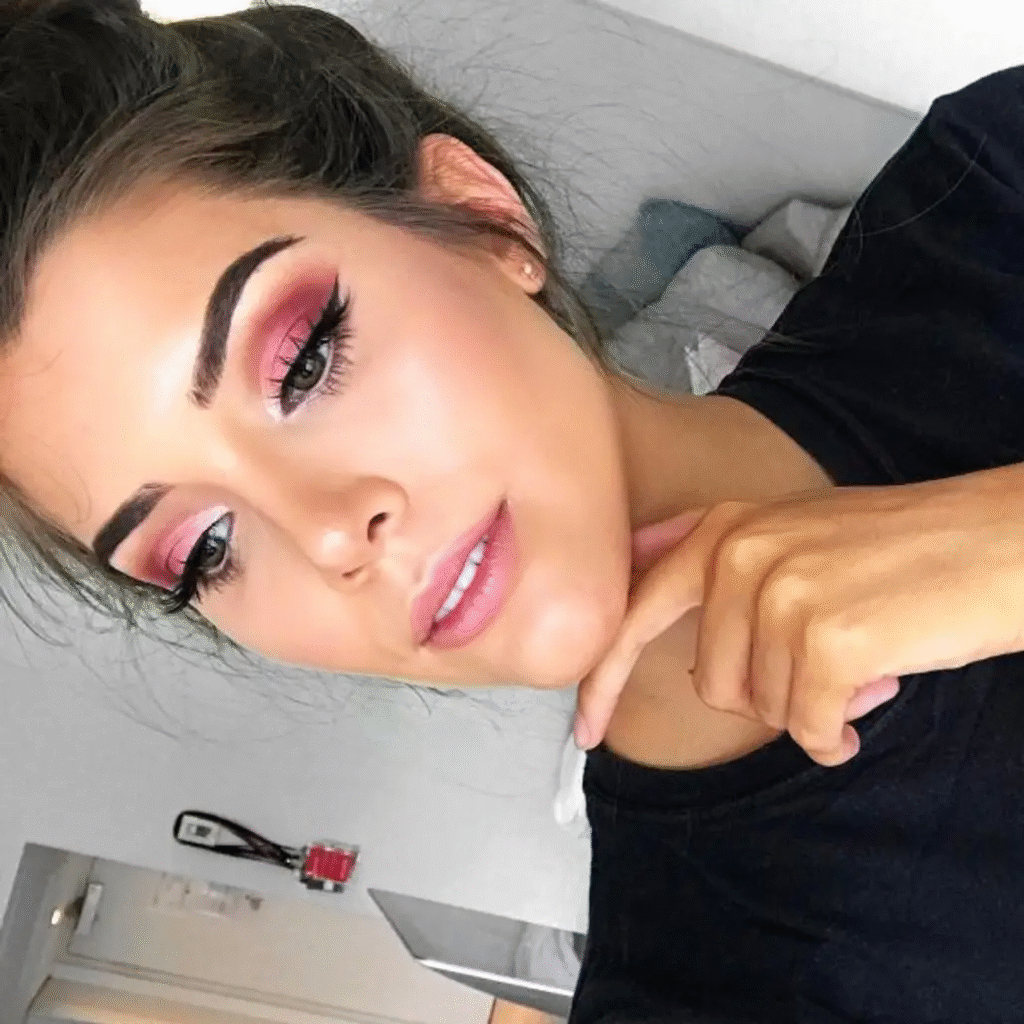Put on a bold lip to go with your pink. That wine red has a pink tint that goes wonderfully with the eye shadow.