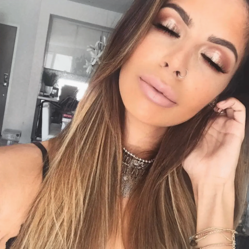 I love the pink lip with the perfect line of gold on her eyes. I also love her hair and how her necklace brings out her eyes.